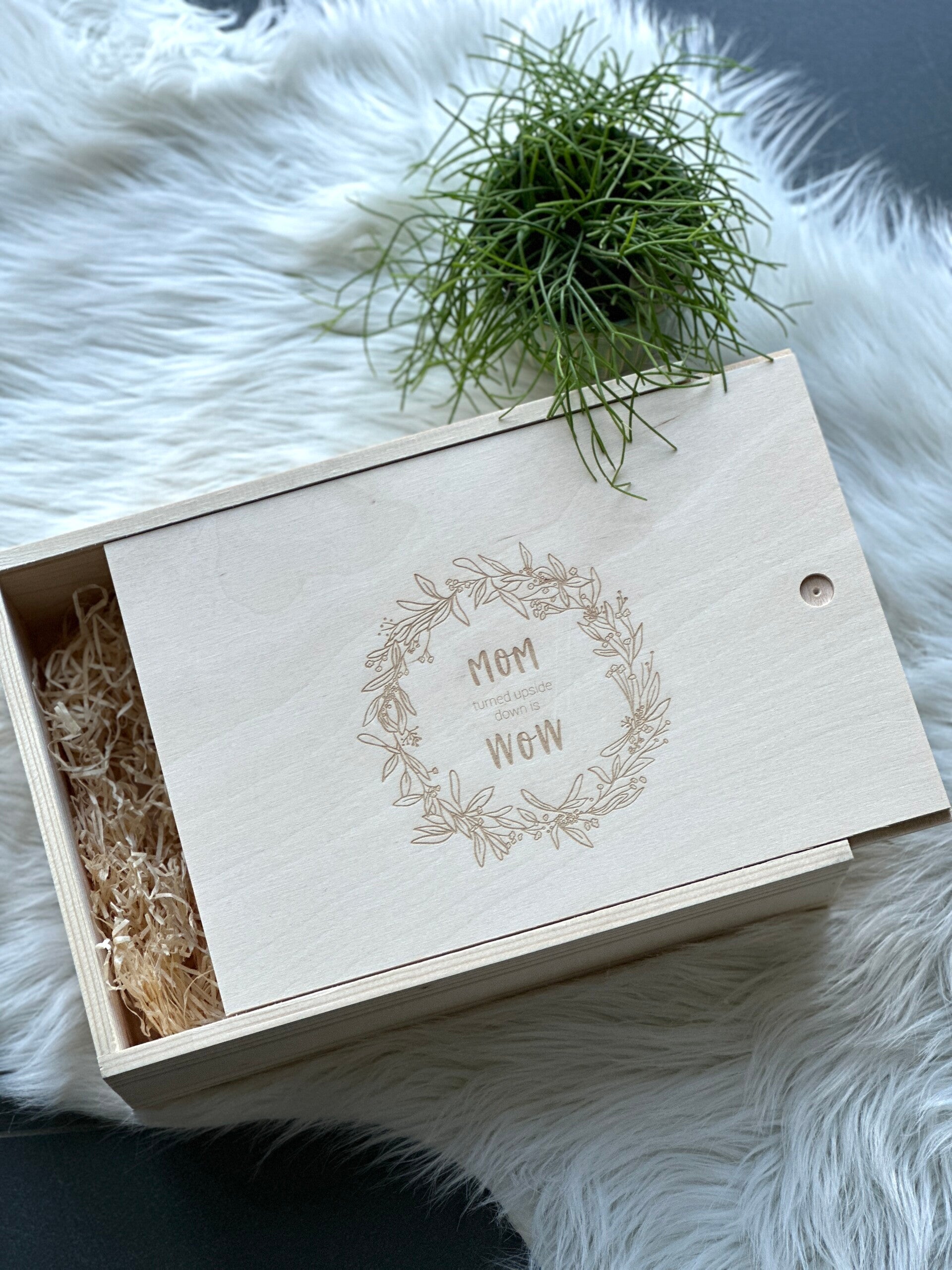 # Houten box met schuifdeksel, met gravering nav moederdag (indien je een andere gravering wenst, stuur gerust een bericht).