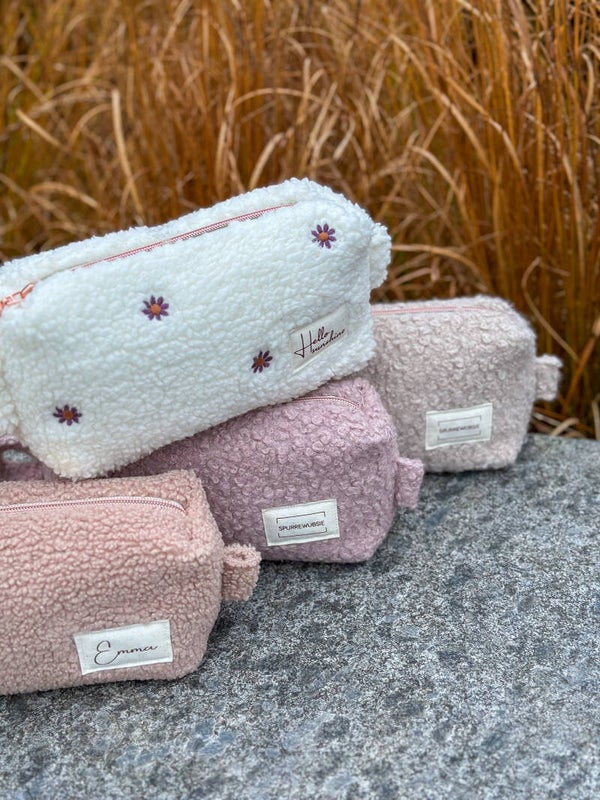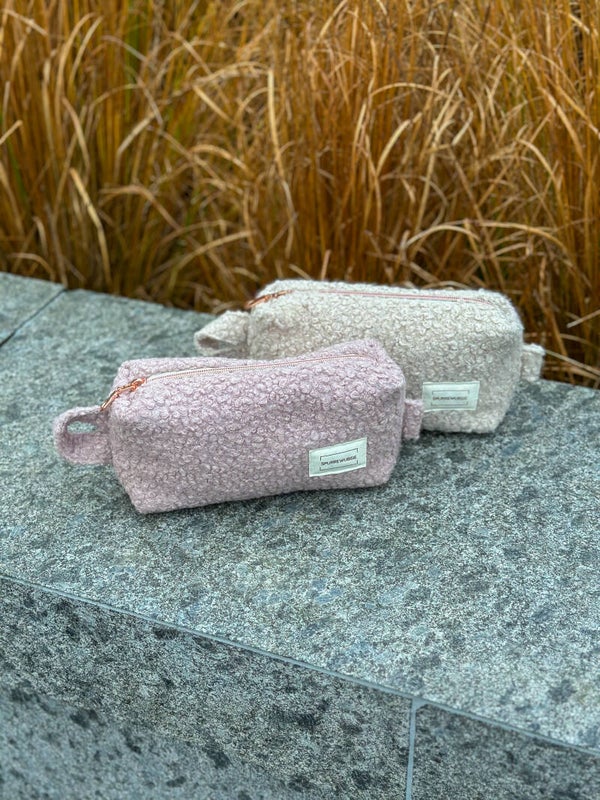 Deze ritstasjes in zachte teddy en boucle zijn niet alleen stijlvol maar ook heerlijk knus om vast te houden. Perfect om kleine spullen mee te nemen, of het nu gaat om make-up, sleutels, of andere essentials die je graag bij de hand hebt. Met zorg handgemaakt en afgewerkt tot in de kleinste details, zijn deze tasjes een ideale mix van praktisch en charmant.
