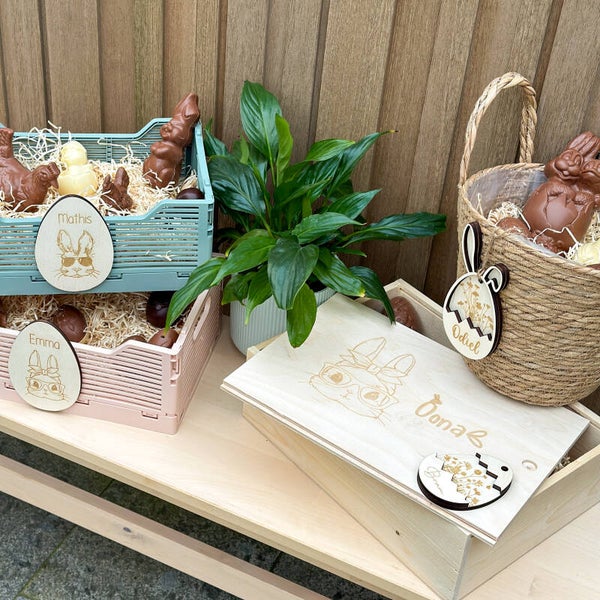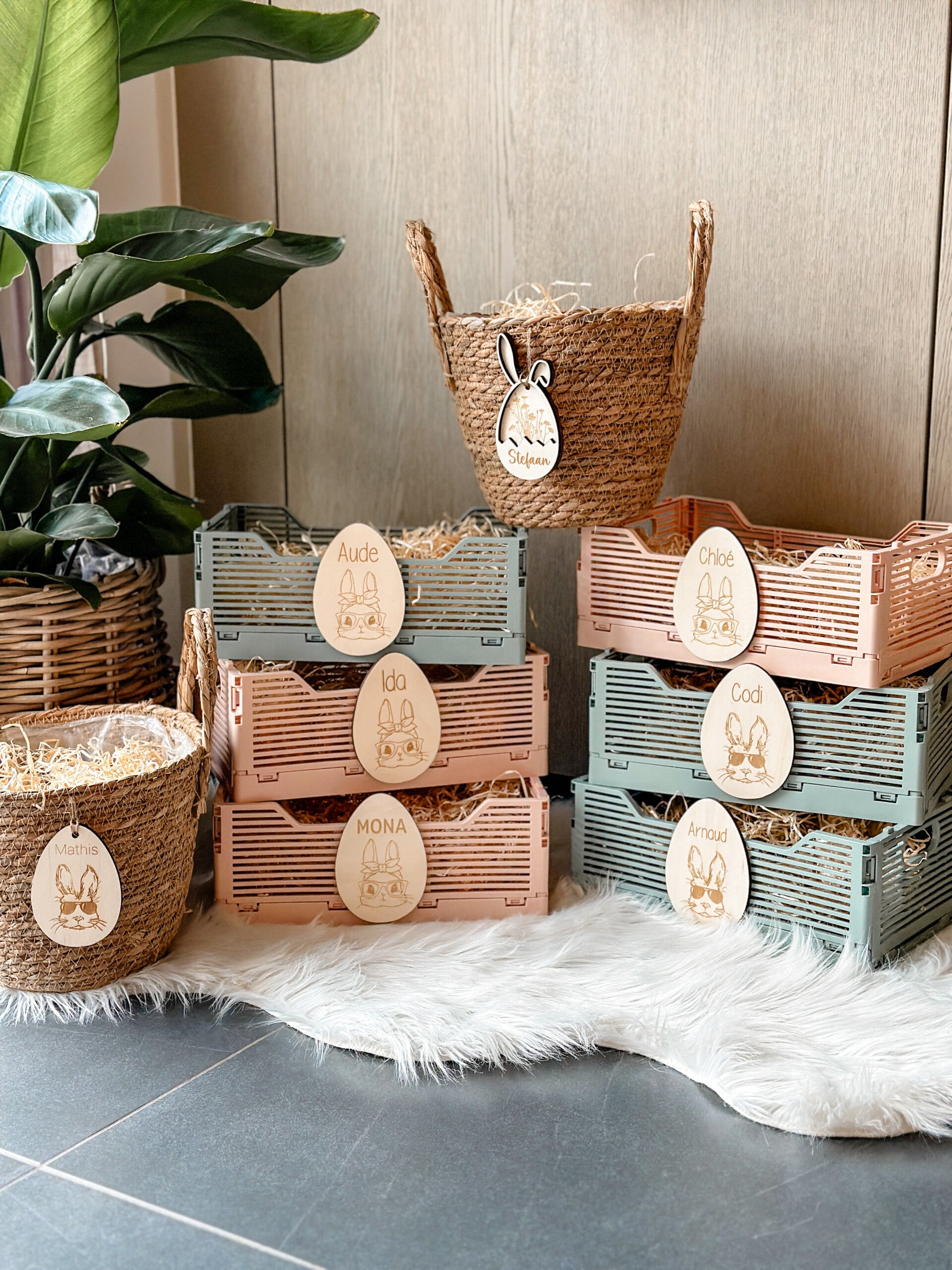 Een kratje met een gepesonaliseerde tag van de paashaas (mannelijk of vrouwelijk). Achteraf is de tag gemakkelijk te verwijderen (de tesa-tape verwijderen). Het kratje kan opgeplooid worden.