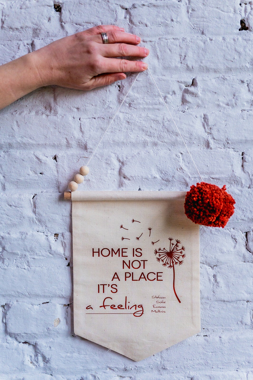 Banner met "home is not a place it's a feeling" en de namen van de gezinsleden.