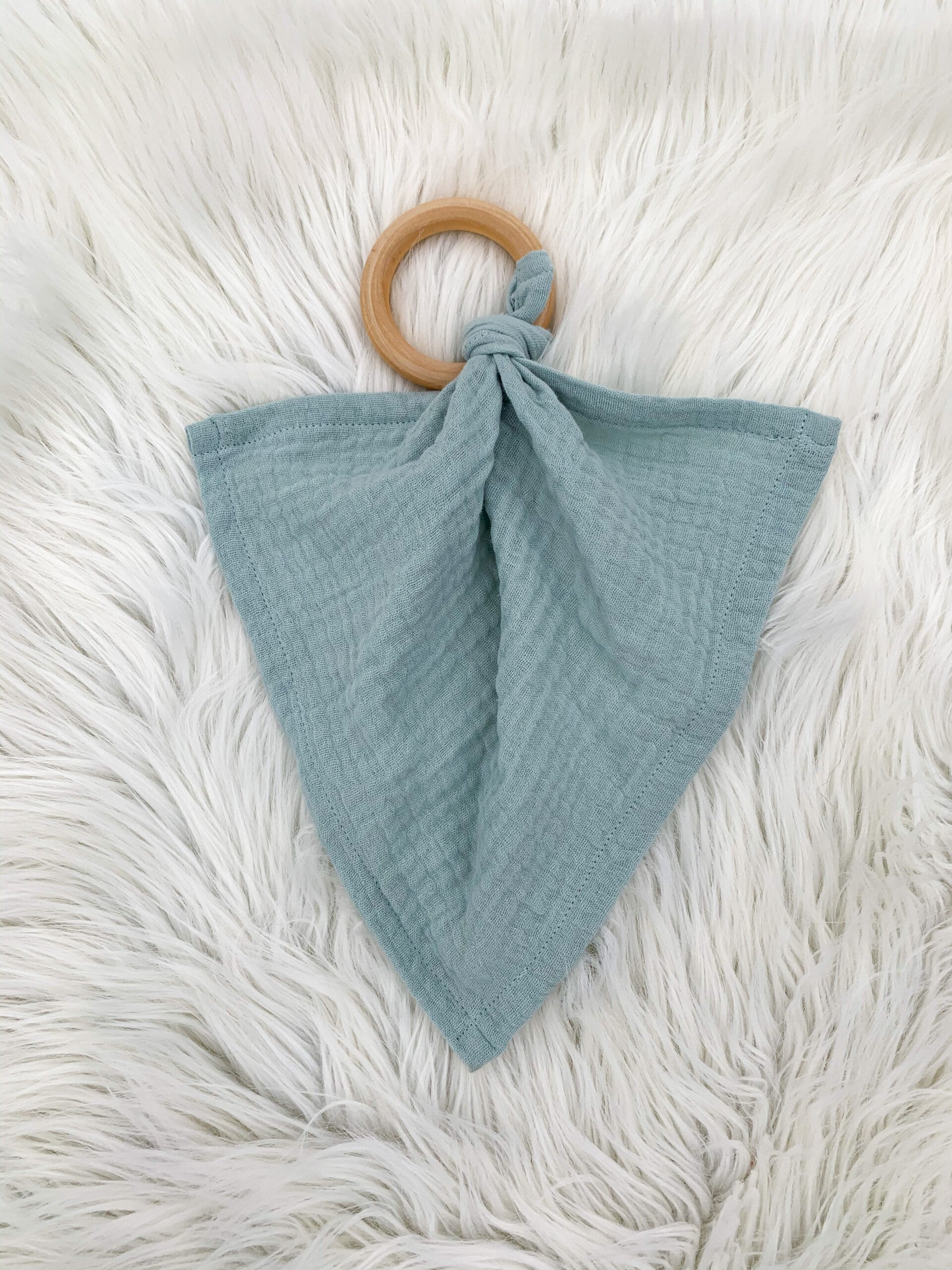 Glad houten bijtring, veilig voor een baby en doorkomende tandjes. Aan de ring hangt een vastgeknoopt knuffeldoekje van tetrastof (hydrofiel katoen).