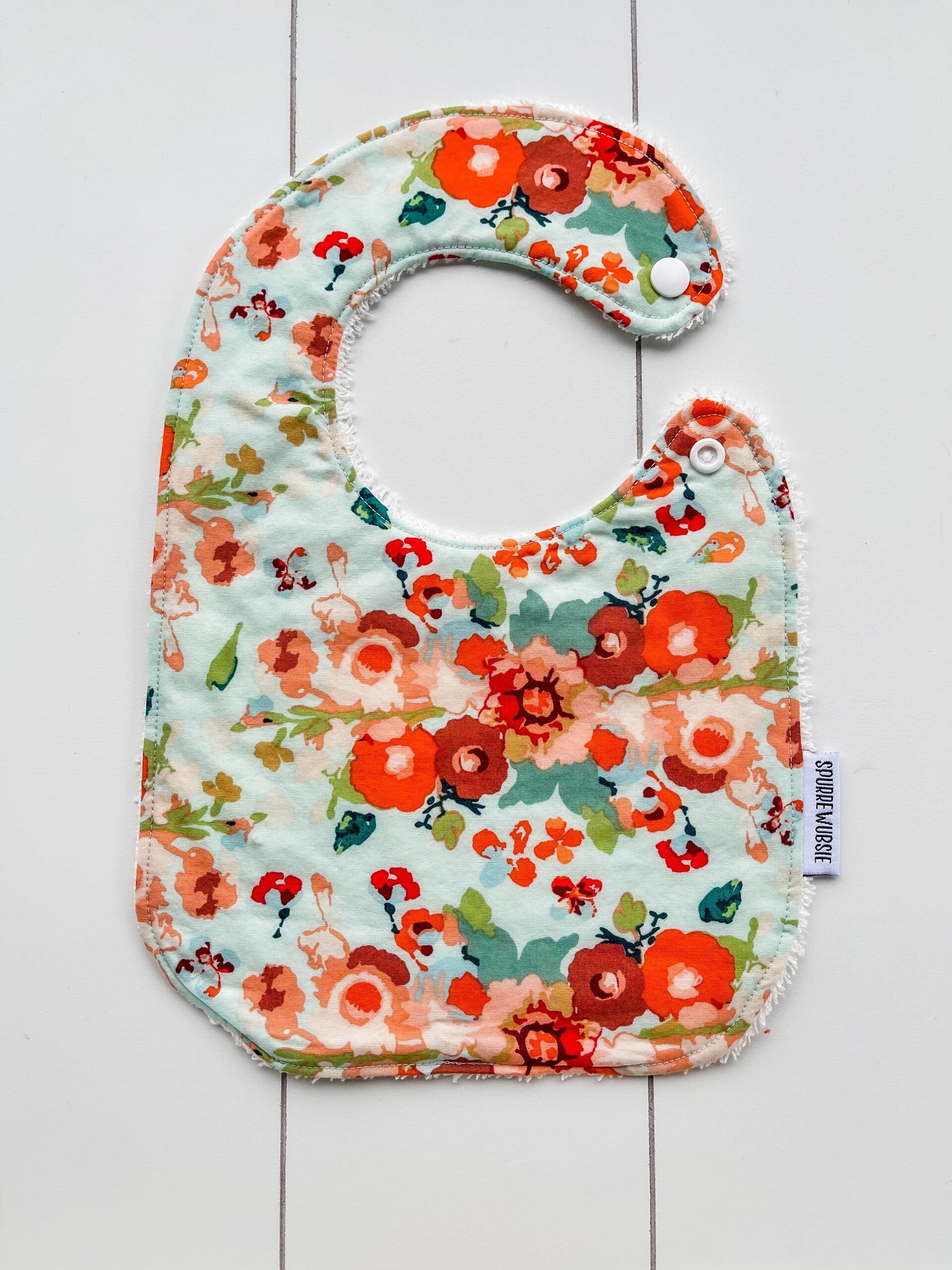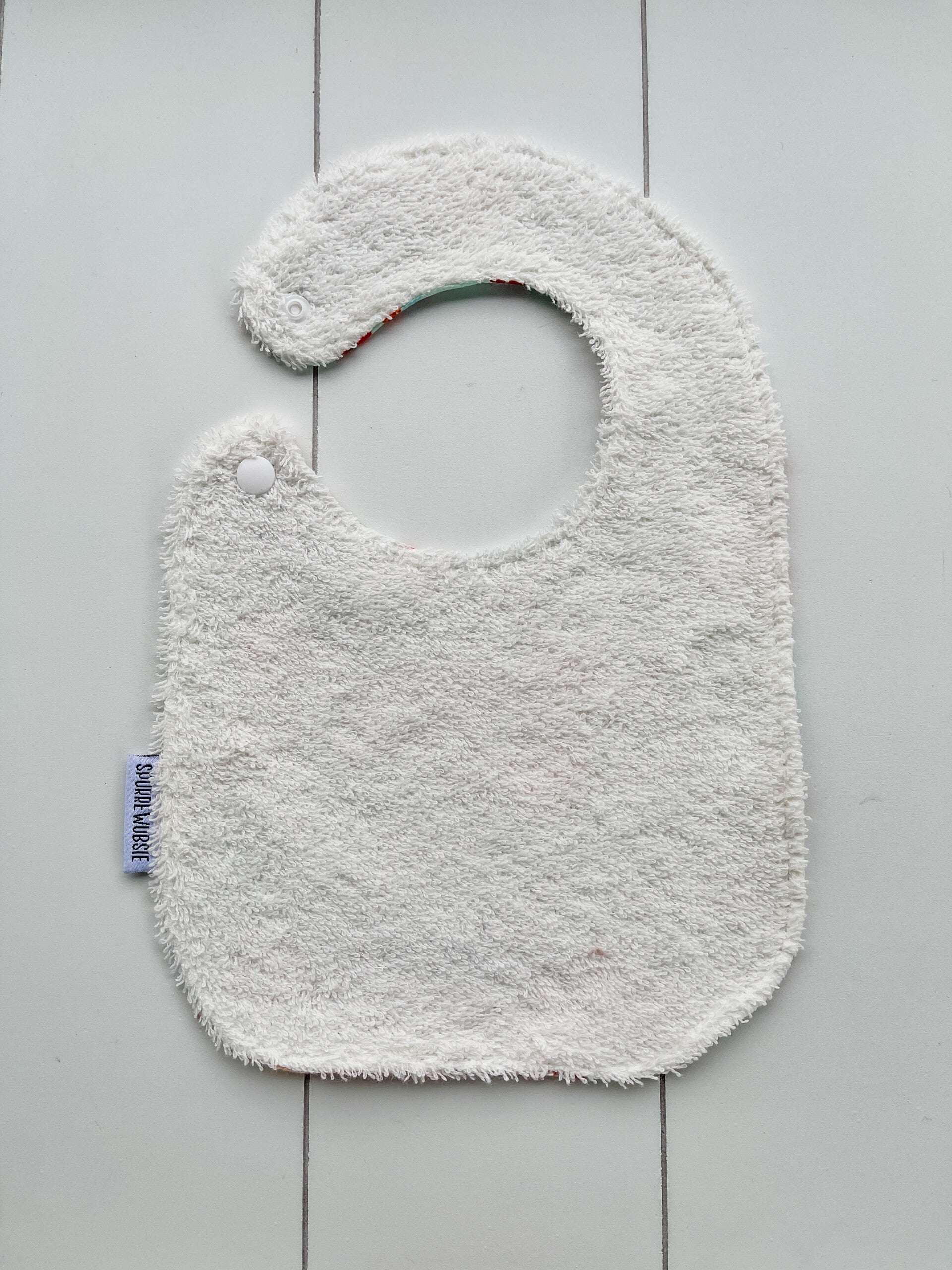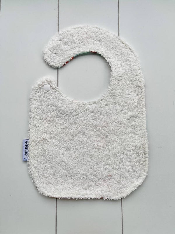 Slabbetje uit katoen, met badstof of wafelstof als achterkant. Het slabbetje kan langs beide kanten gedragen worden.