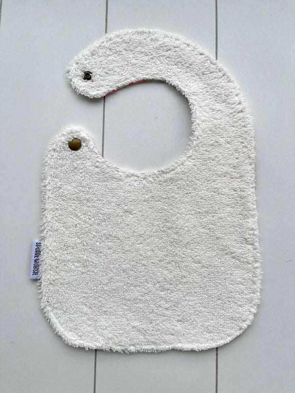 Slabbetje uit katoen, met badstof of wafelstof als achterkant. Het slabbetje kan langs beide kanten gedragen worden.