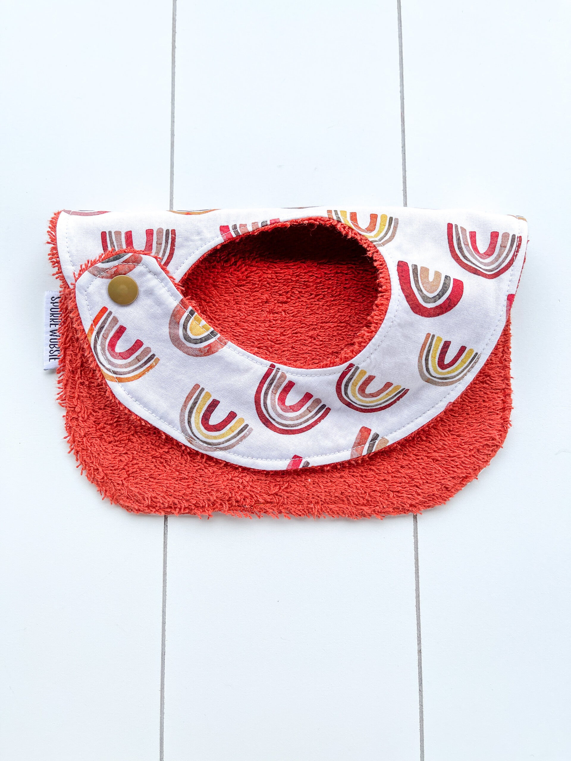 Slabbetje uit katoen, met badstof of wafelstof als achterkant. Het slabbetje kan langs beide kanten gedragen worden.