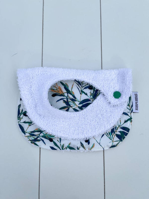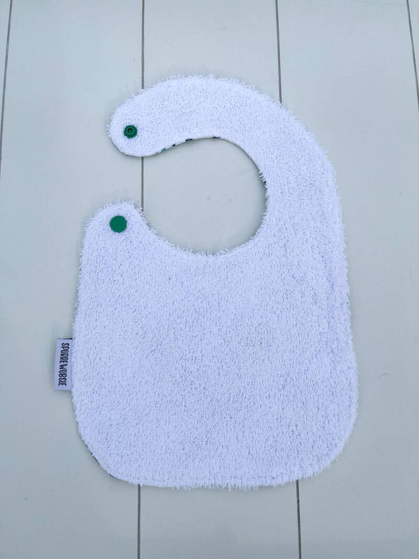 Slabbetje uit katoen, met badstof of wafelstof als achterkant. Het slabbetje kan langs beide kanten gedragen worden.