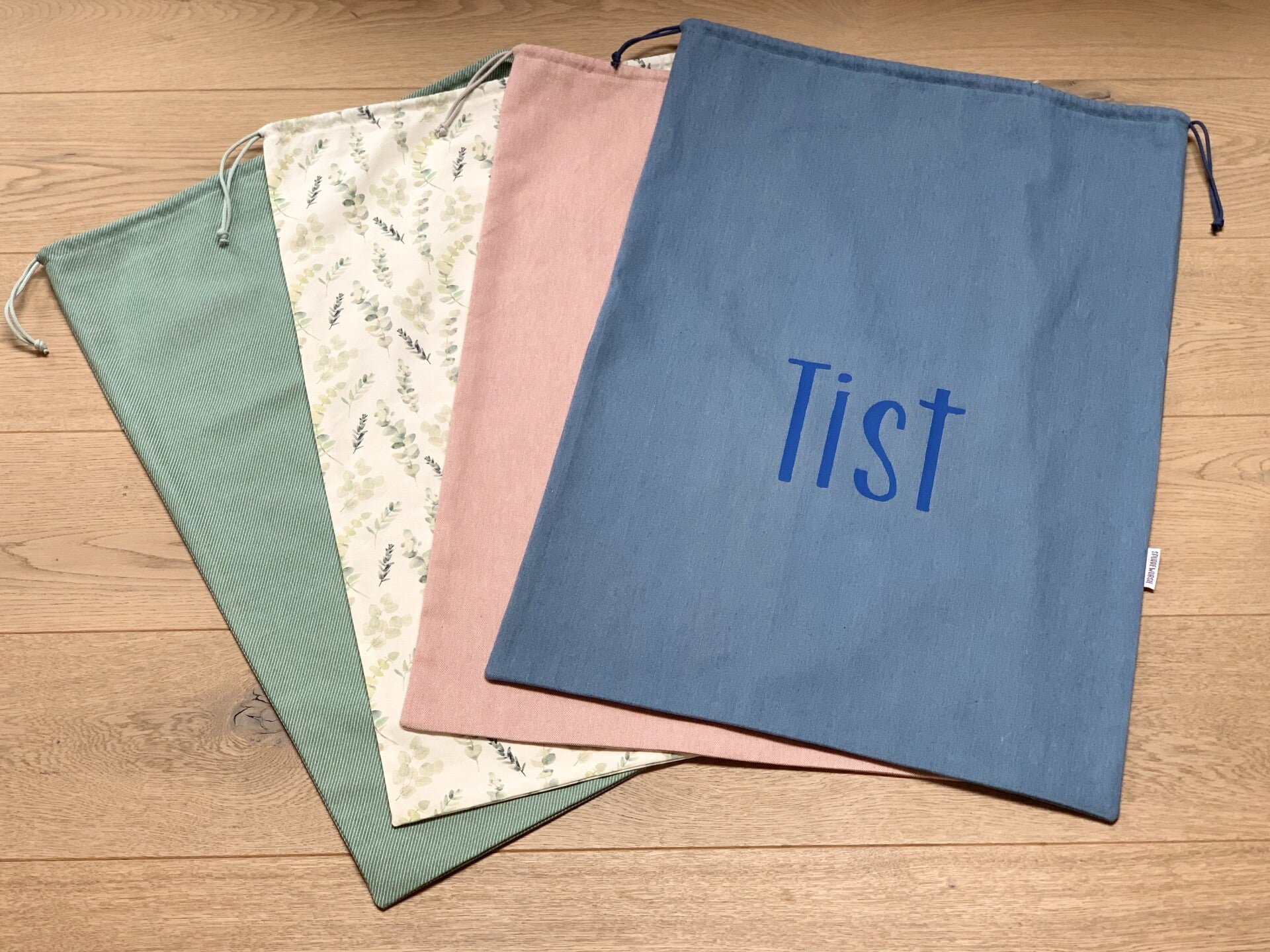 Waszak in katoen (lichter van stof dan de canvas)Deze stof wordt in overleg gekozen, dus vraag gerust uw voorkeur! Deze worden al of niet gepersonaliseerd gemaakt.Gepersonaliseerd met naam: + 4 euroAfgewerkte afmeting: 69 cm x 49 cm