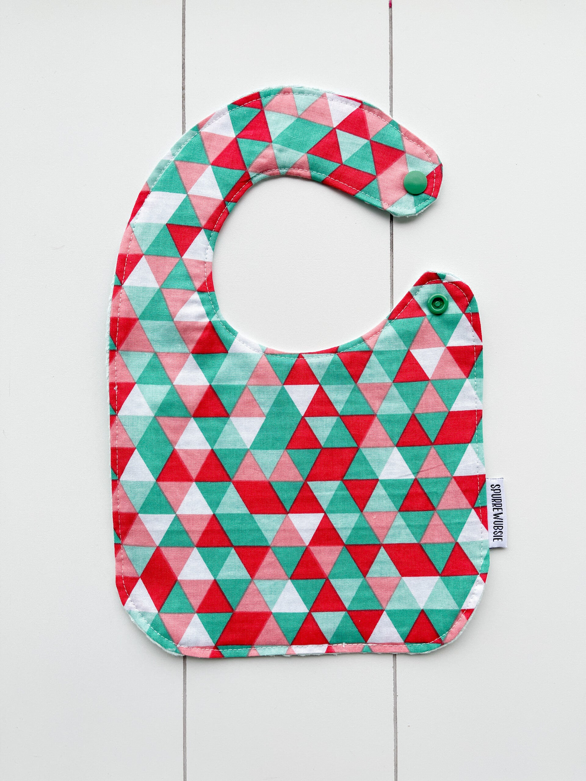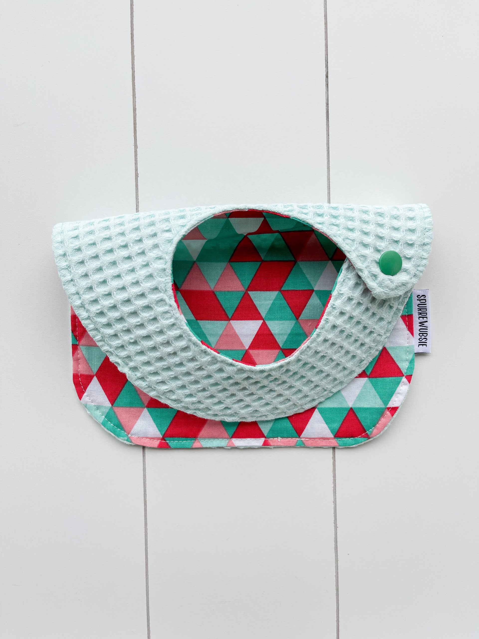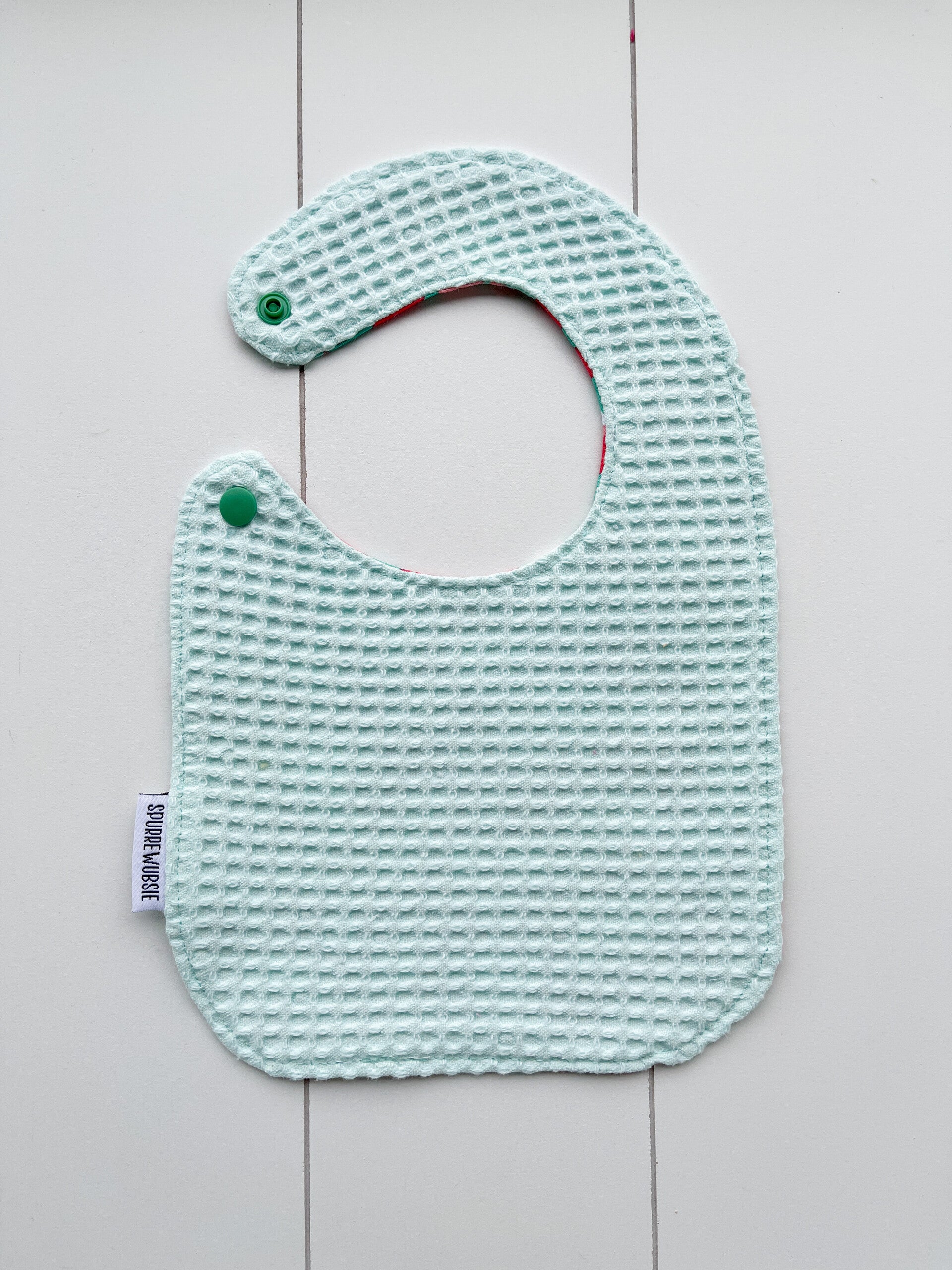 Slabbetje uit katoen, met badstof of wafelstof als achterkant. Het slabbetje kan langs beide kanten gedragen worden.