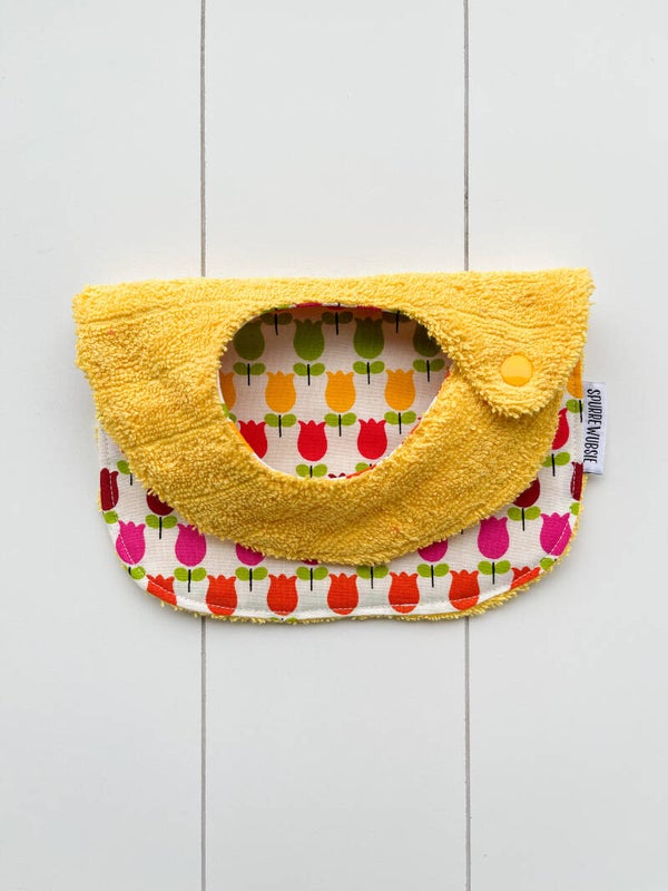 Slabbetje uit katoen, met badstof of wafelstof als achterkant. Het slabbetje kan langs beide kanten gedragen worden.