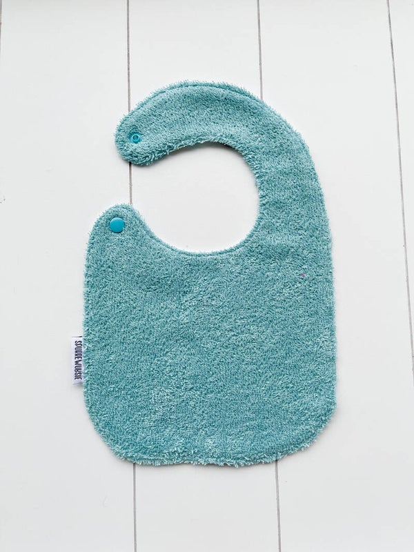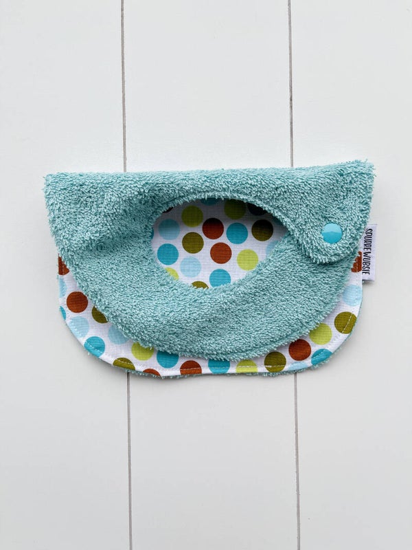 Slabbetje uit katoen, met badstof of wafelstof als achterkant. Het slabbetje kan langs beide kanten gedragen worden.
