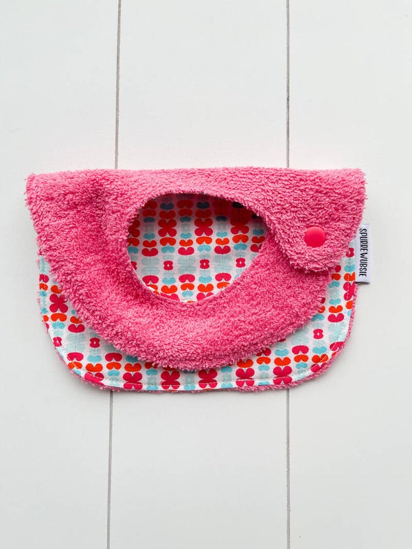 Slabbetje uit katoen, met badstof of wafelstof als achterkant. Het slabbetje kan langs beide kanten gedragen worden.