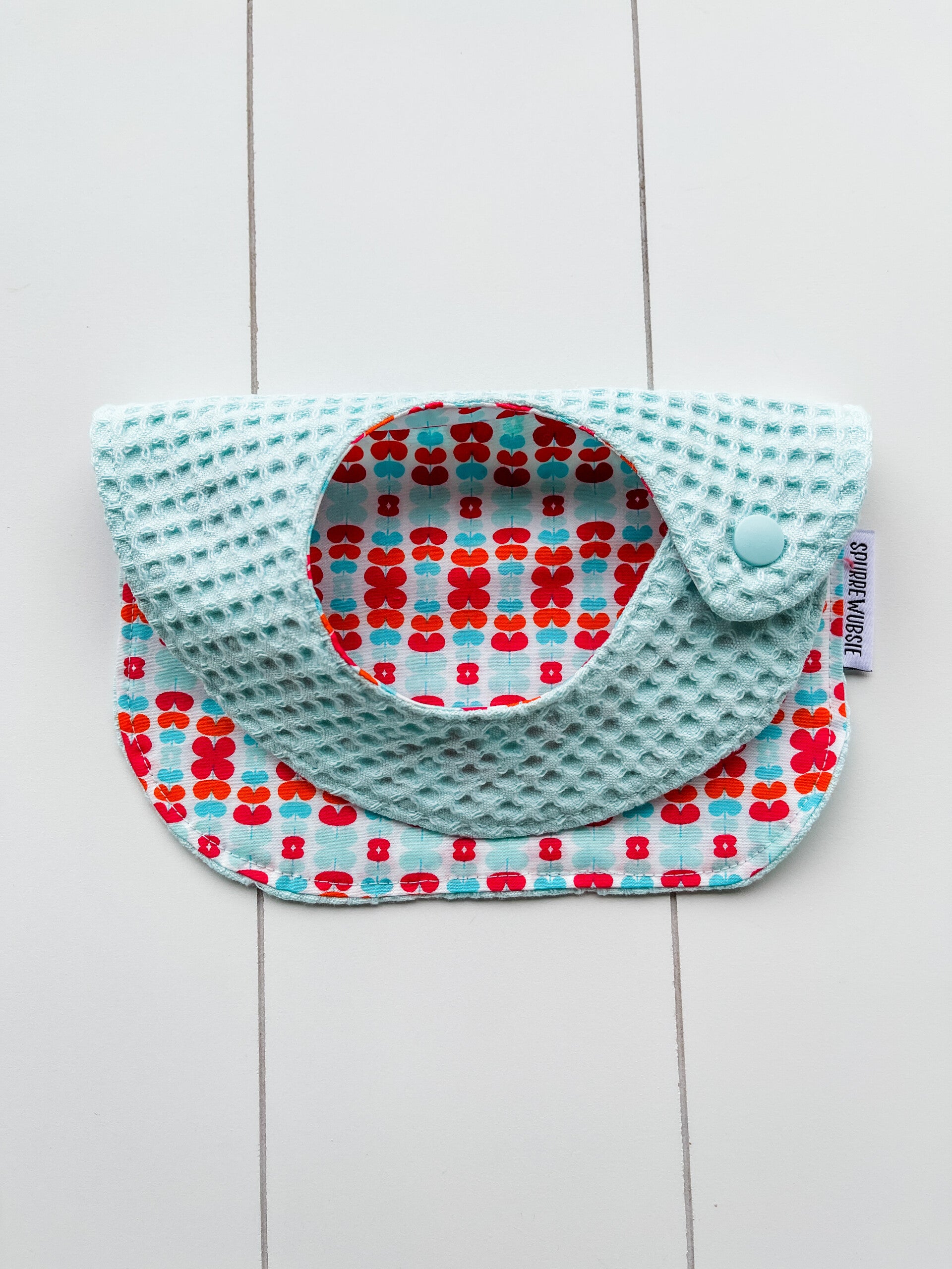 Slabbetje uit katoen, met badstof of wafelstof als achterkant. Het slabbetje kan langs beide kanten gedragen worden.
