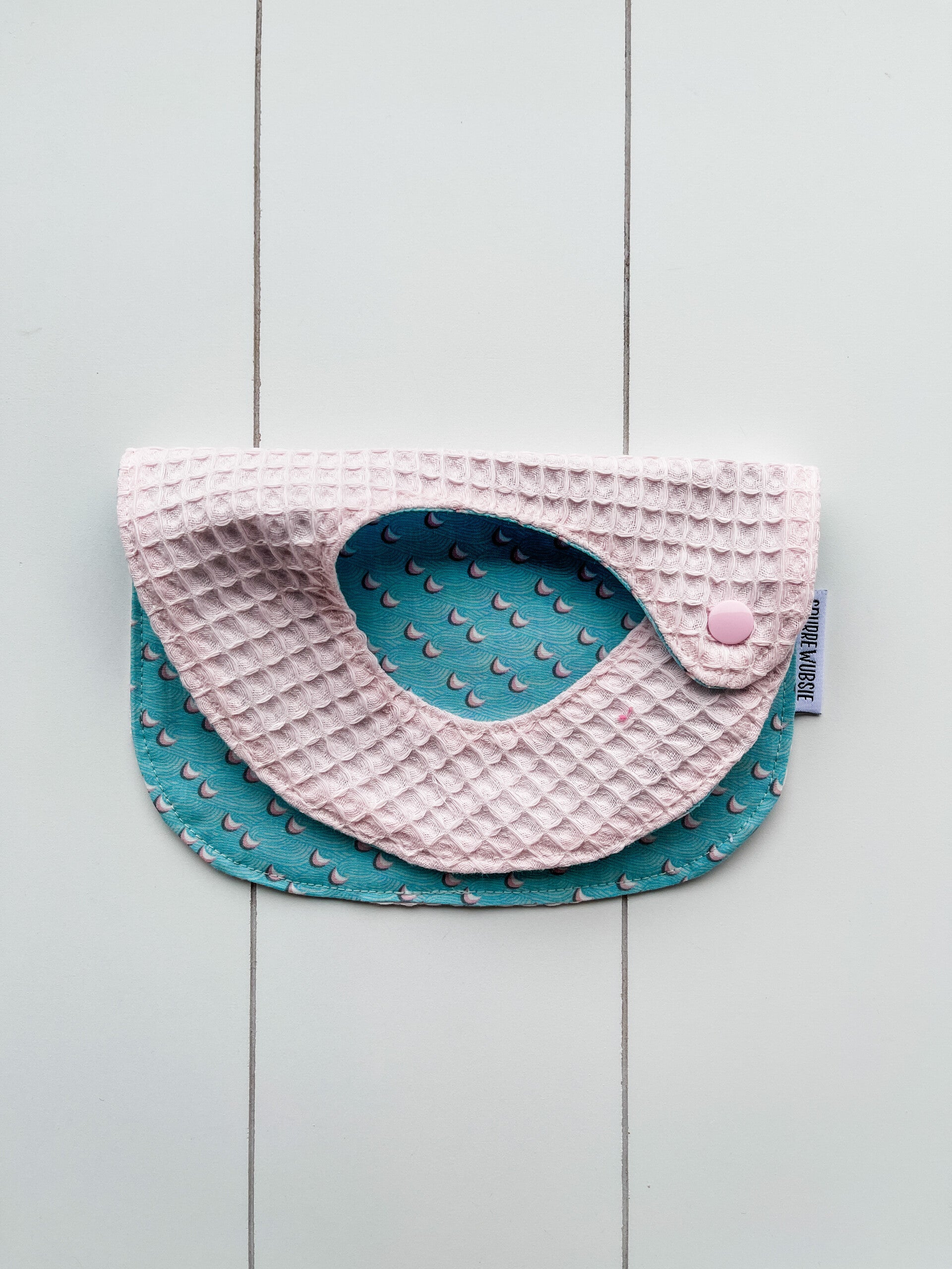 Slabbetje uit katoen, met badstof of wafelstof als achterkant. Het slabbetje kan langs beide kanten gedragen worden.