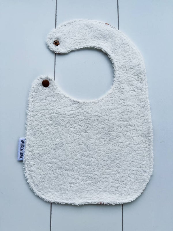 Slabbetje uit katoen, met badstof of wafelstof als achterkant. Het slabbetje kan langs beide kanten gedragen worden.
