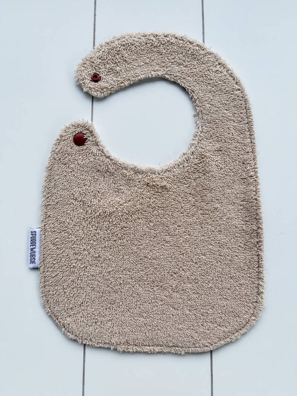 Slabbetje uit katoen, met badstof of wafelstof als achterkant. Het slabbetje kan langs beide kanten gedragen worden.