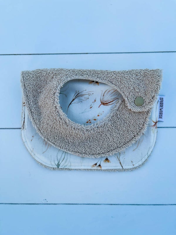 Slabbetje uit katoen, met badstof of wafelstof als achterkant. Het slabbetje kan langs beide kanten gedragen worden.