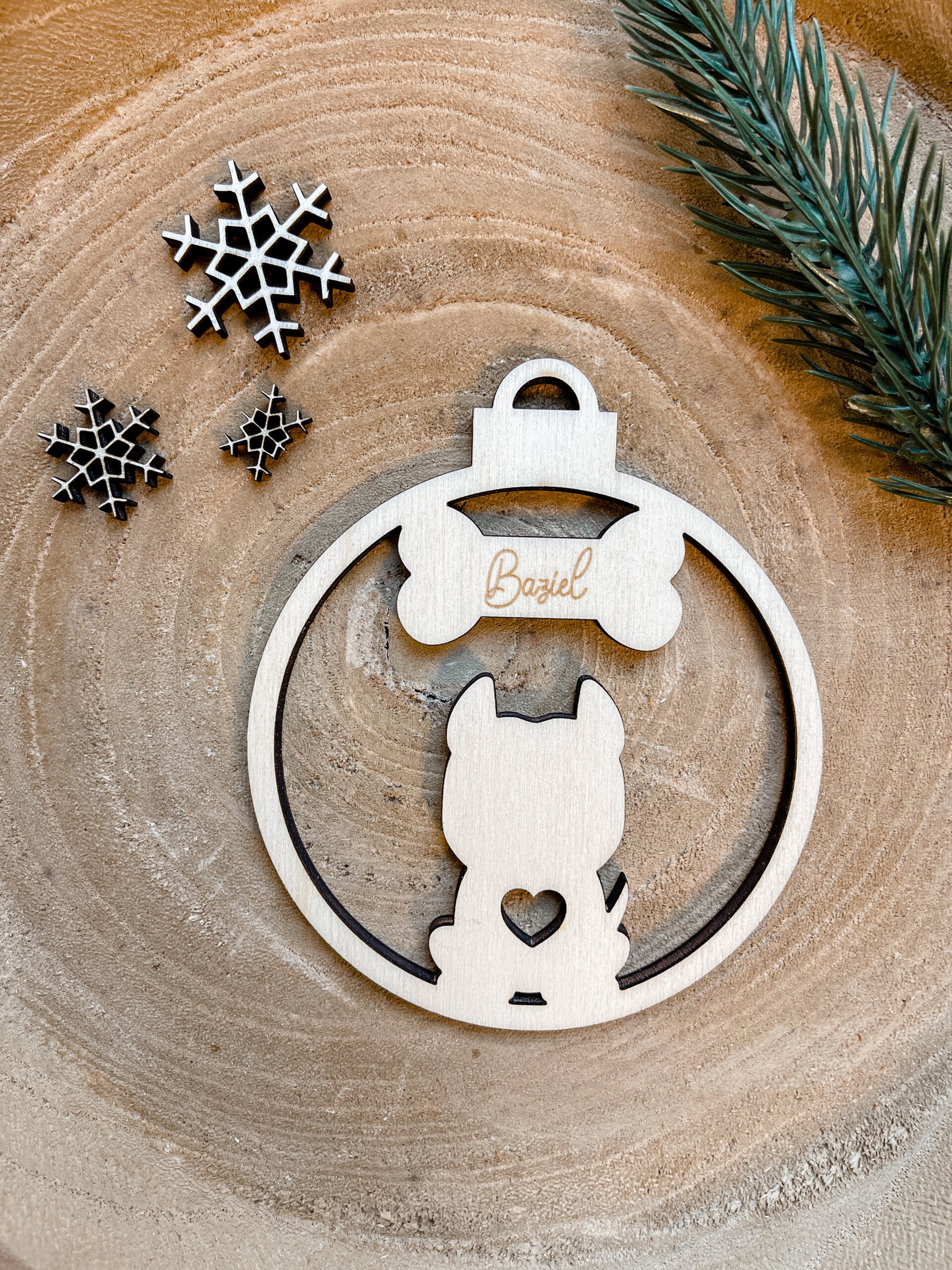 Gepersonaliseerde houten kerstbal voor een hond - Baziel