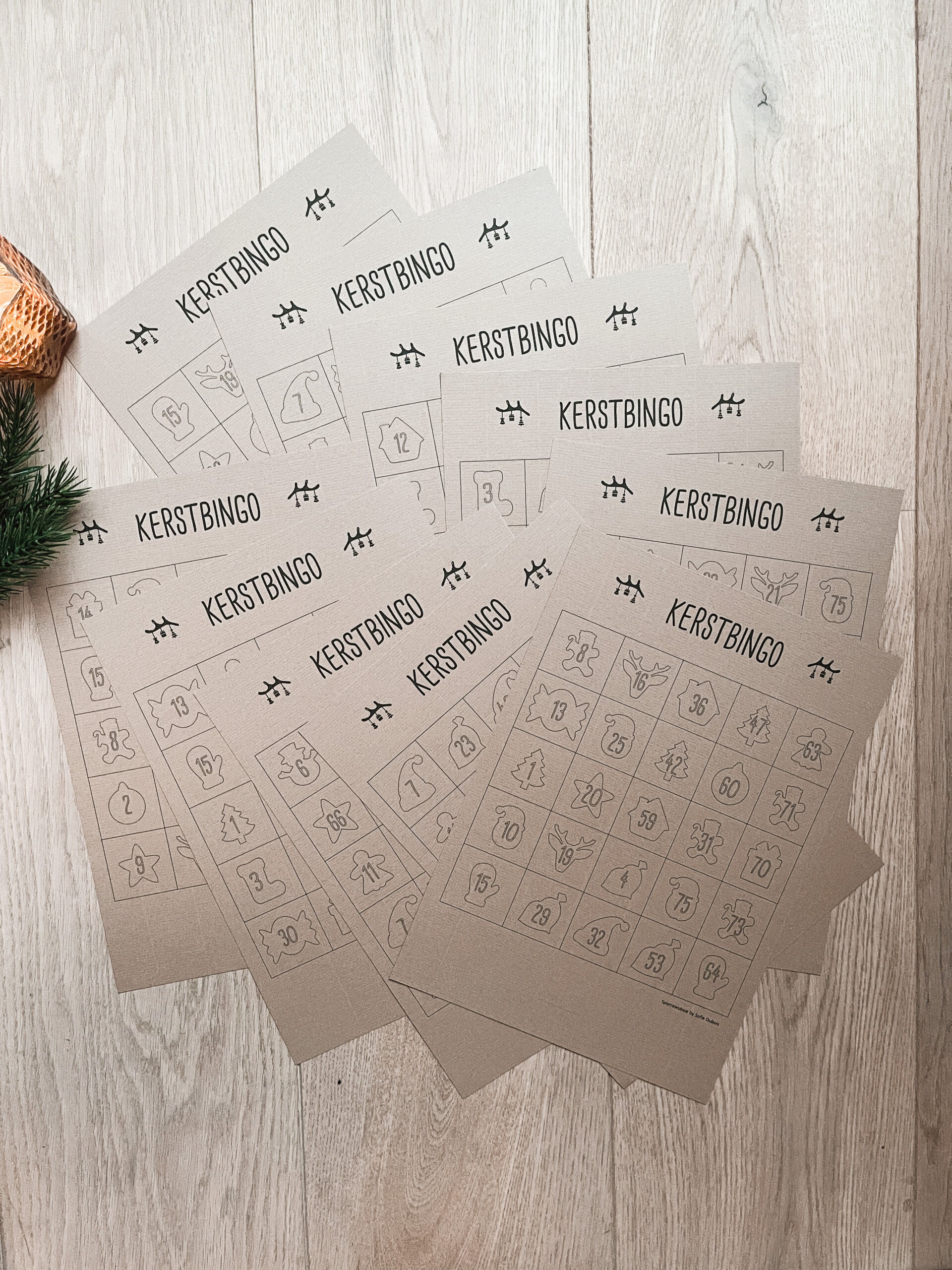 π 10 kerstbingokaarten: 10 verschillende kaarten uit hoogwaardig 160 grams karton van Rössler. Diezelfde bingokaarten zitten alle 10 nog eens in een pakketje wit A4-papier om ze voor volgende spelletjes te kunnen kopiëren.