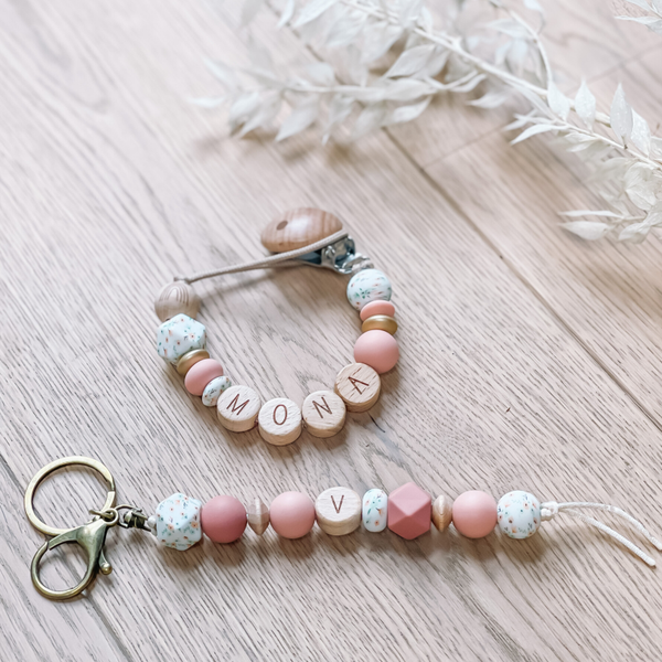 - De tutterkoord is handgemaakt met nylonkoord, siliconen en houten kralen en een houten clip. De sleutelhangers zijn gemaakt met satijnkoord. De houten letterkralen (FSC) zijn onbewerkt en veilig te gebruiken en de siliconen kralen zijn vrij van BPA, Lood, Ftalaten en PVC en getest conform de Europese veiligheidsnormen (CE-norm).