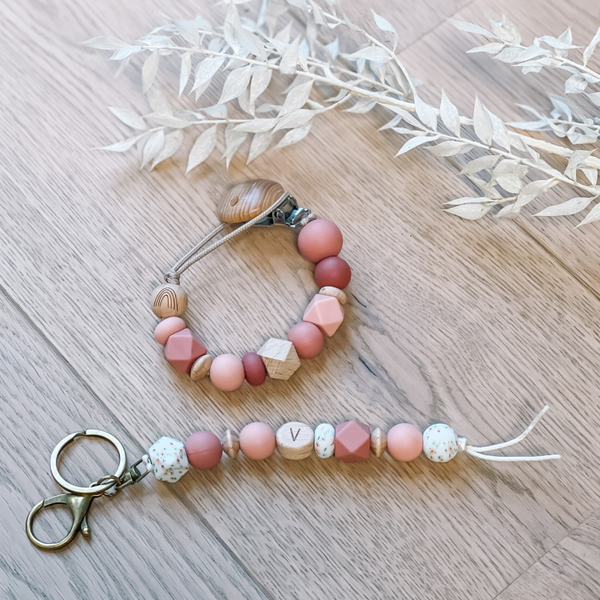 - De tutterkoord is handgemaakt met nylonkoord, siliconen en houten kralen en een houten clip. De sleutelhangers zijn gemaakt met satijnkoord. De houten letterkralen (FSC) zijn onbewerkt en veilig te gebruiken en de siliconen kralen zijn vrij van BPA, Lood, Ftalaten en PVC en getest conform de Europese veiligheidsnormen (CE-norm).