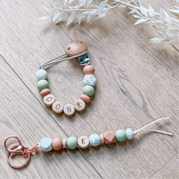 - De tutterkoord is handgemaakt met nylonkoord, siliconen en houten kralen en een houten clip. De sleutelhangers zijn gemaakt met satijnkoord. De houten letterkralen (FSC) zijn onbewerkt en veilig te gebruiken en de siliconen kralen zijn vrij van BPA, Lood, Ftalaten en PVC en getest conform de Europese veiligheidsnormen (CE-norm).