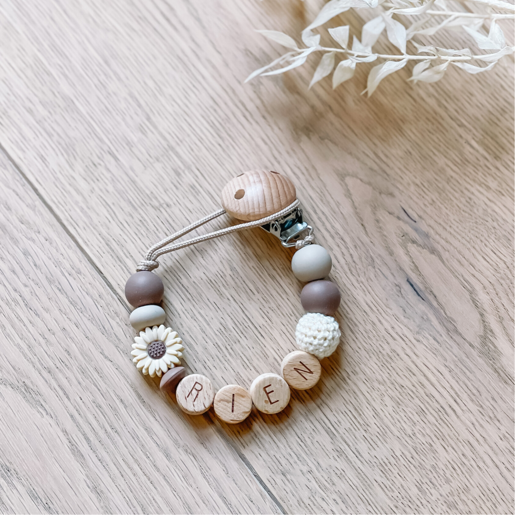 - De tutterkoord is handgemaakt met nylonkoord, siliconen en houten kralen en een houten clip. De sleutelhangers zijn gemaakt met satijnkoord. De houten letterkralen (FSC) zijn onbewerkt en veilig te gebruiken en de siliconen kralen zijn vrij van BPA, Lood, Ftalaten en PVC en getest conform de Europese veiligheidsnormen (CE-norm).