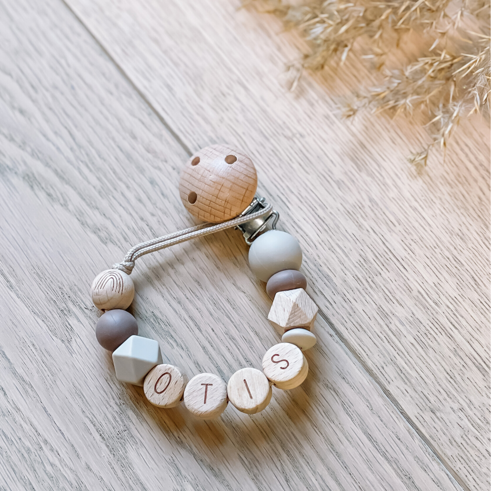 - De tutterkoord is handgemaakt met nylonkoord, siliconen en houten kralen en een houten clip. De sleutelhangers zijn gemaakt met satijnkoord. De houten letterkralen (FSC) zijn onbewerkt en veilig te gebruiken en de siliconen kralen zijn vrij van BPA, Lood, Ftalaten en PVC en getest conform de Europese veiligheidsnormen (CE-norm).