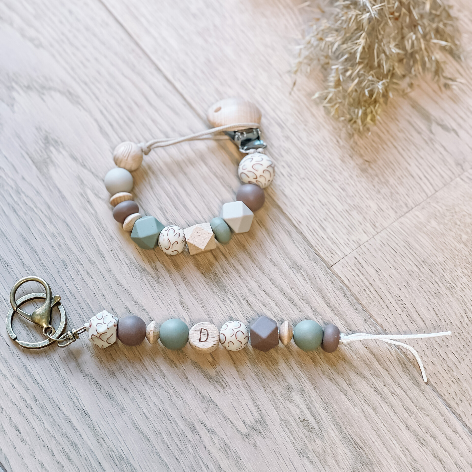 - De tutterkoord is handgemaakt met nylonkoord, siliconen en houten kralen en een houten clip. De sleutelhangers zijn gemaakt met satijnkoord. De houten letterkralen (FSC) zijn onbewerkt en veilig te gebruiken en de siliconen kralen zijn vrij van BPA, Lood, Ftalaten en PVC en getest conform de Europese veiligheidsnormen (CE-norm).