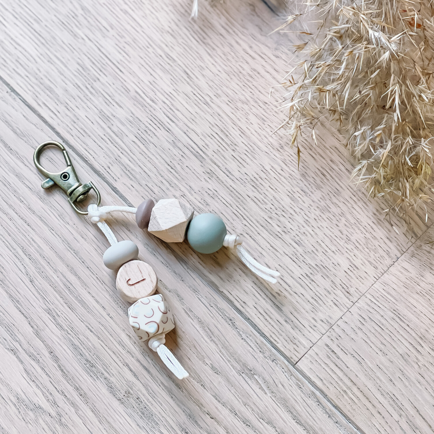- De tutterkoord is handgemaakt met nylonkoord, siliconen en houten kralen en een houten clip. De sleutelhangers zijn gemaakt met satijnkoord. De houten letterkralen (FSC) zijn onbewerkt en veilig te gebruiken en de siliconen kralen zijn vrij van BPA, Lood, Ftalaten en PVC en getest conform de Europese veiligheidsnormen (CE-norm).