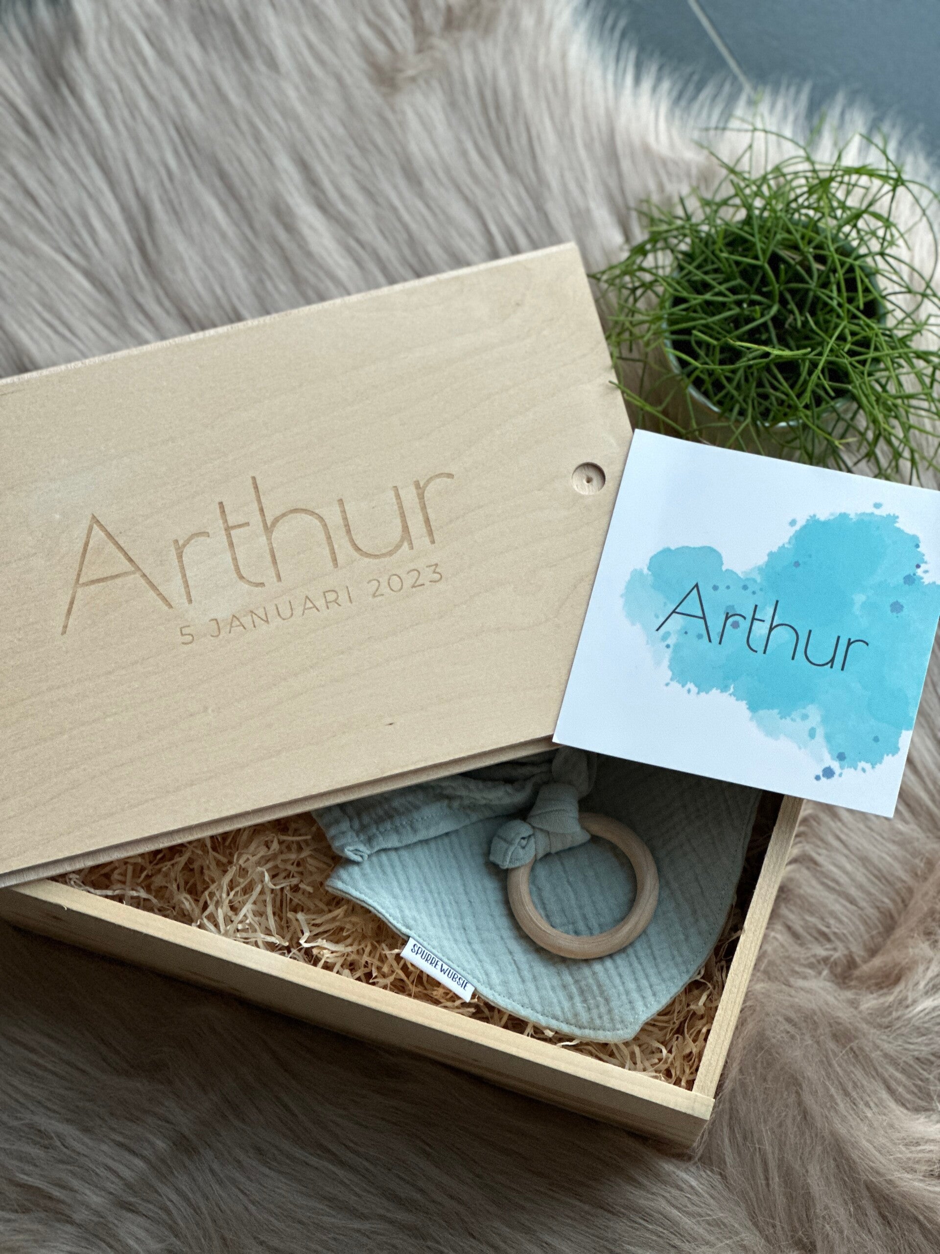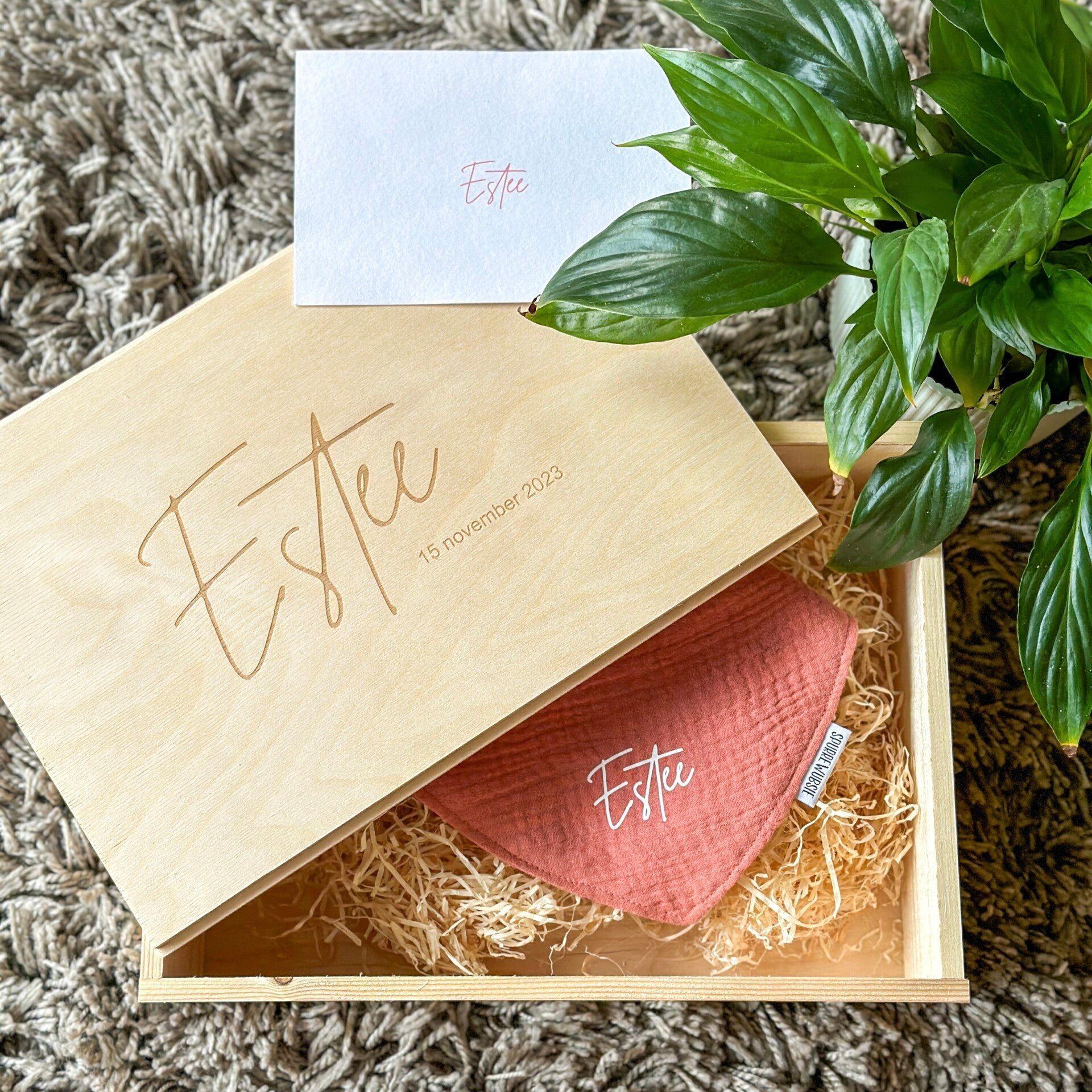 Houten kist met schuifdeksel gepersonaliseerd als kraamgeschenk.